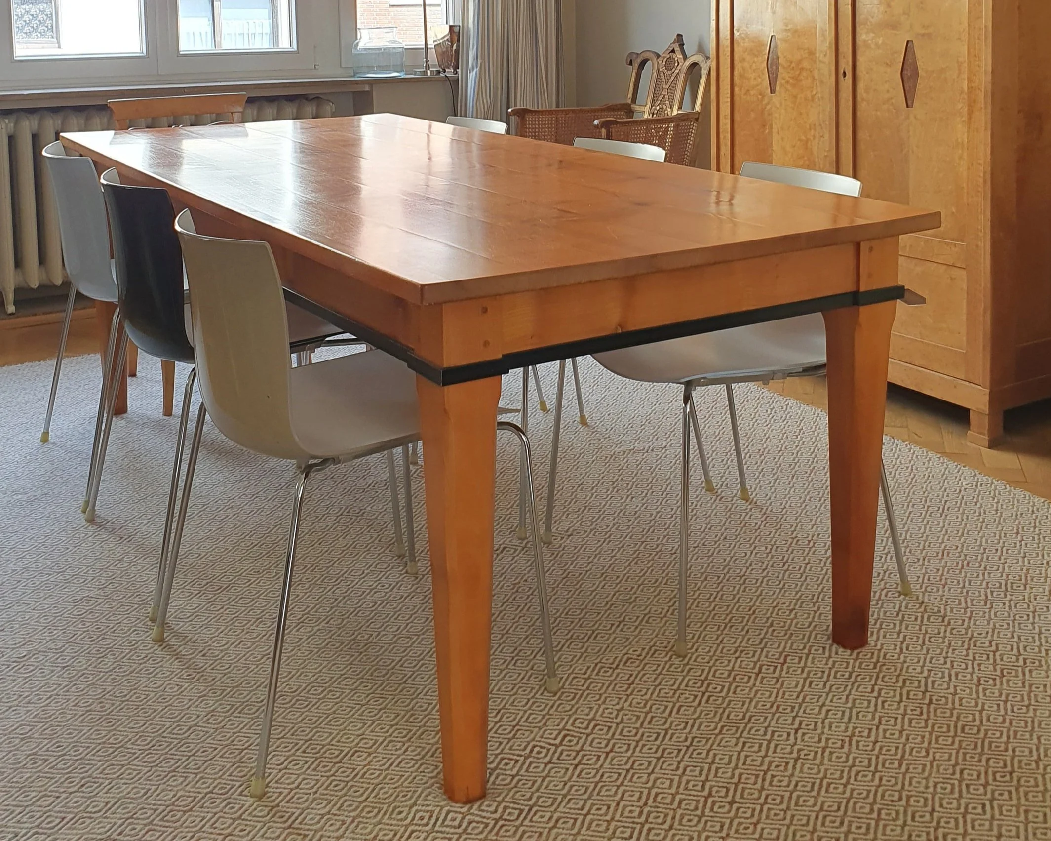 Unser Esstisch wurde auf unser Wunschmaß und in unserer Wunschholzfarbe von einem Schreiner im Münsterland gefertigt. Mir gefiel das Detail mit dem schwarzen Rand, welches gut zu unserem Biedermeierschrank passen würde. Der Holzfarbton, kirschbaumfarbig, sollte das Ensemble komplett machen. Im Nachhinein: Ein Riesenfehler! Natürlich war der Beizton nicht in der Farbe passend und überhaupt, viel zu viel Holz im Raum. Bei uns wohnte plötzlich ein 2,50 m langer, orangeroter Riese. Aber wie es so ist - man gewöhnt sich an vieles und es braucht manchmal etwas (in diesem Fall “nur“ 12 Jahre) um eine Änderung in Gang zu bringen. Jetzt aber war der Tag gekommen! Zeit für ein makeover unseres Esszimmertisches.